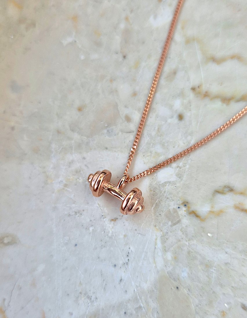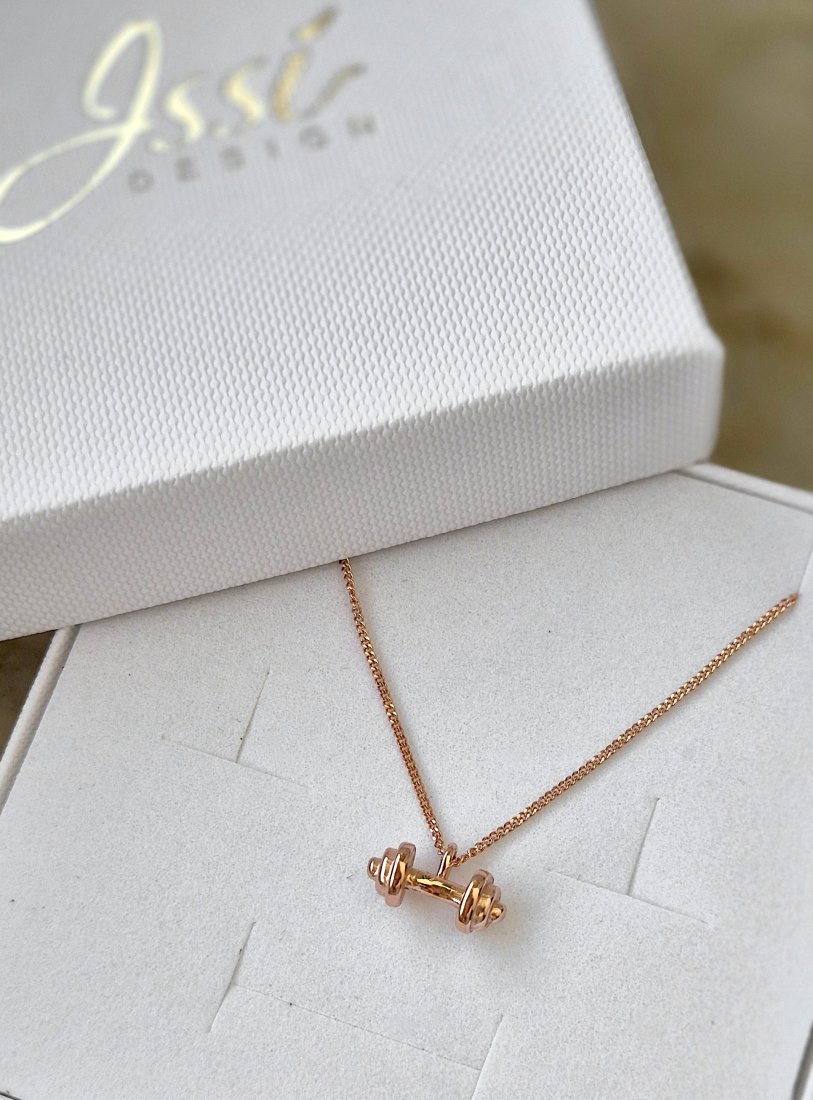 Zawieszka w kształcie sztangi została wykonana z dbałością o proporcje i detale, dzięki czemu wiernie oddaje formę prawdziwego sprzętu treningowego — w eleganckim, biżuteryjnym wydaniu.