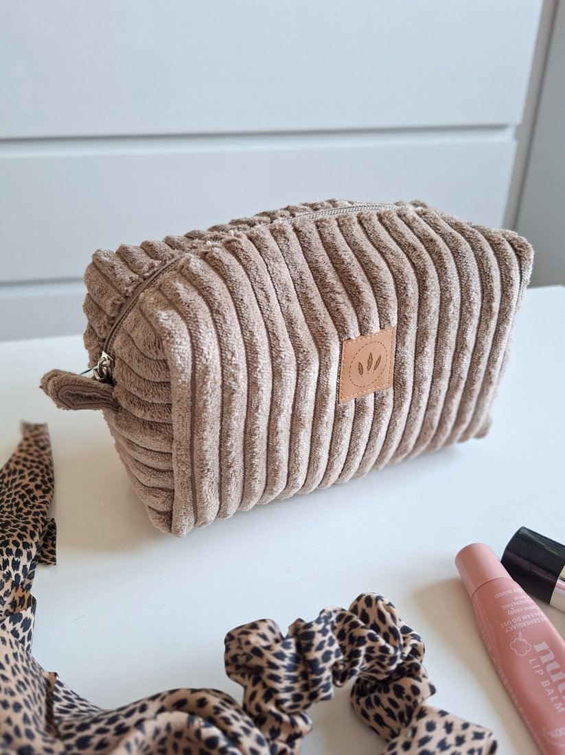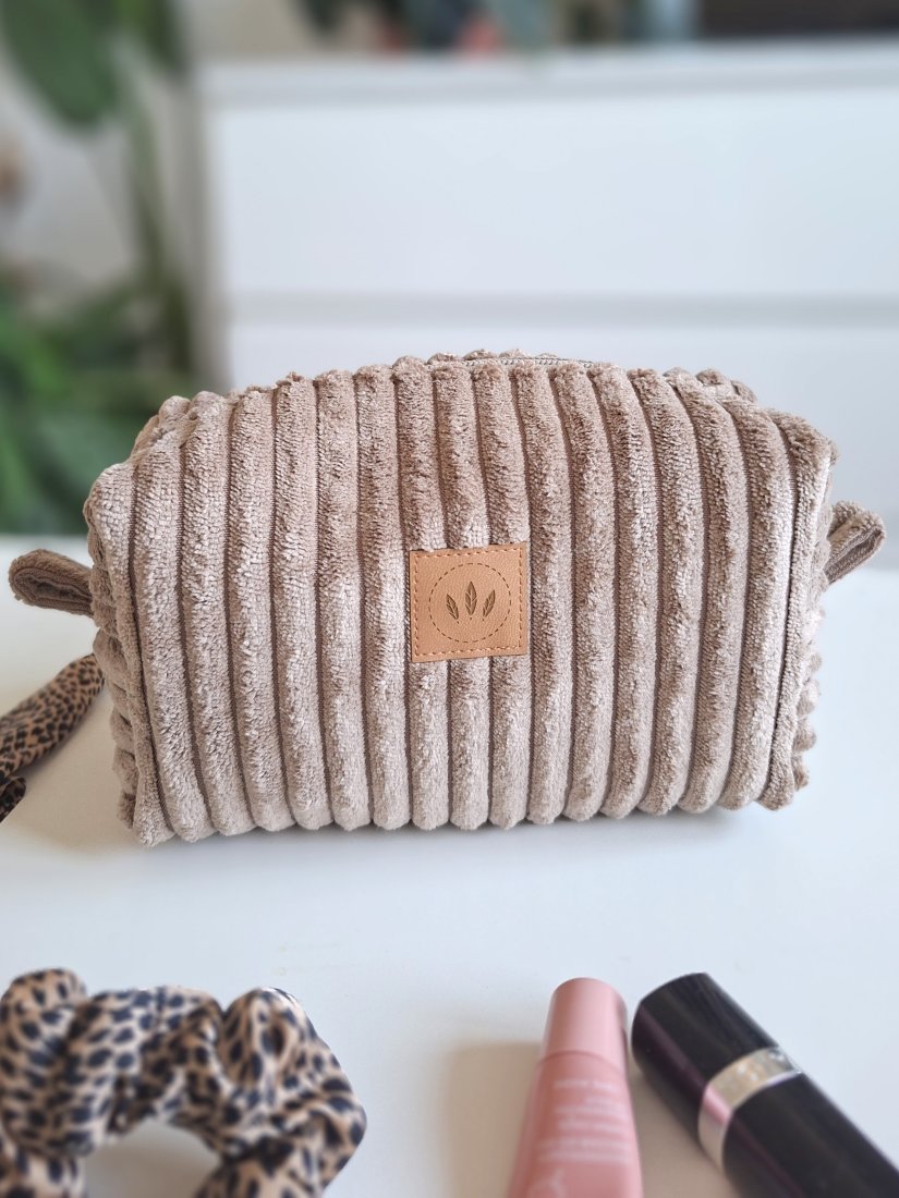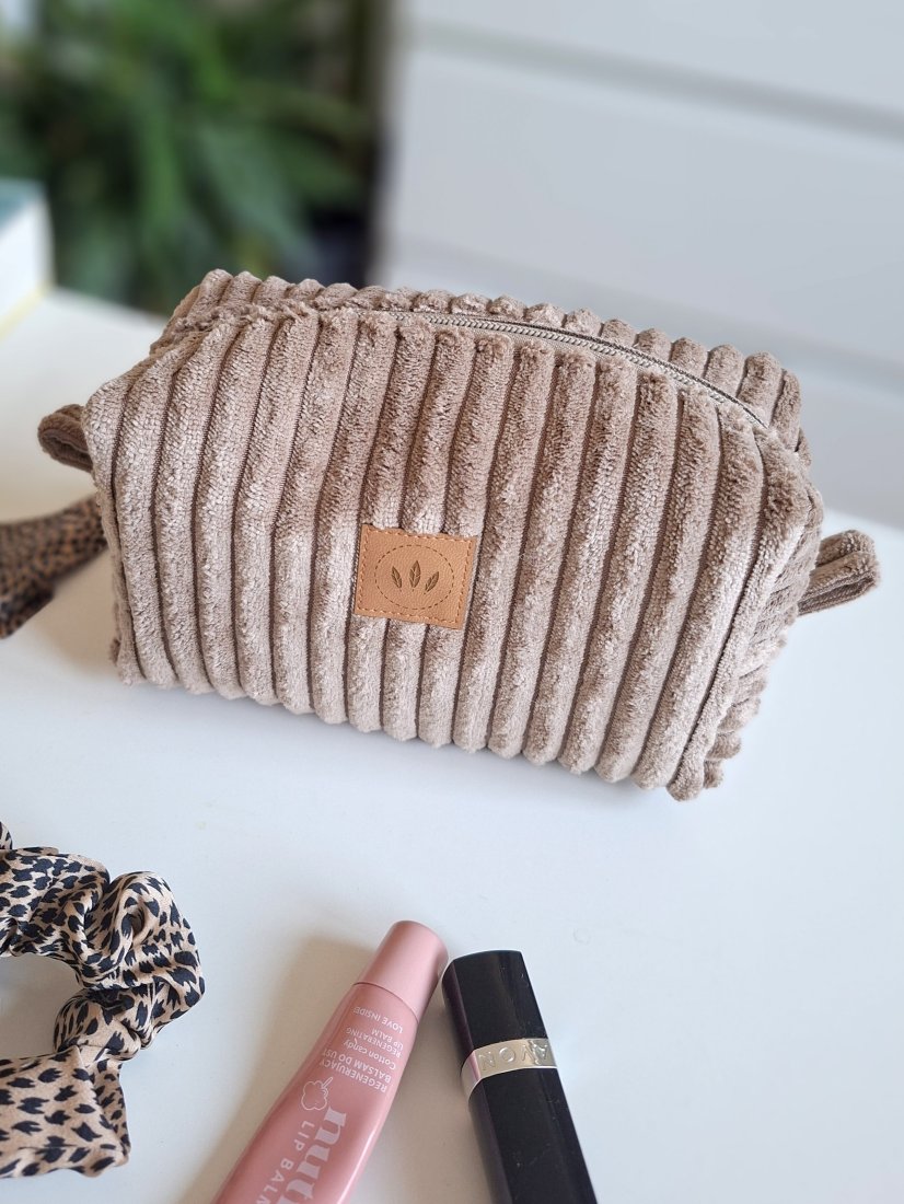 Średniej wielkości kosmetyczka z miękkiego sztruksu w szeroki prążek.