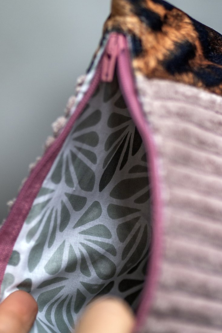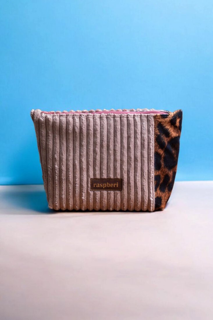 Duża kosmetyczka z weluru w panterkę i grubego sztruksu w kolorze pudroworóżowym. Bardzo przyjemna w dotyku. Wykonana w duchu no waste.