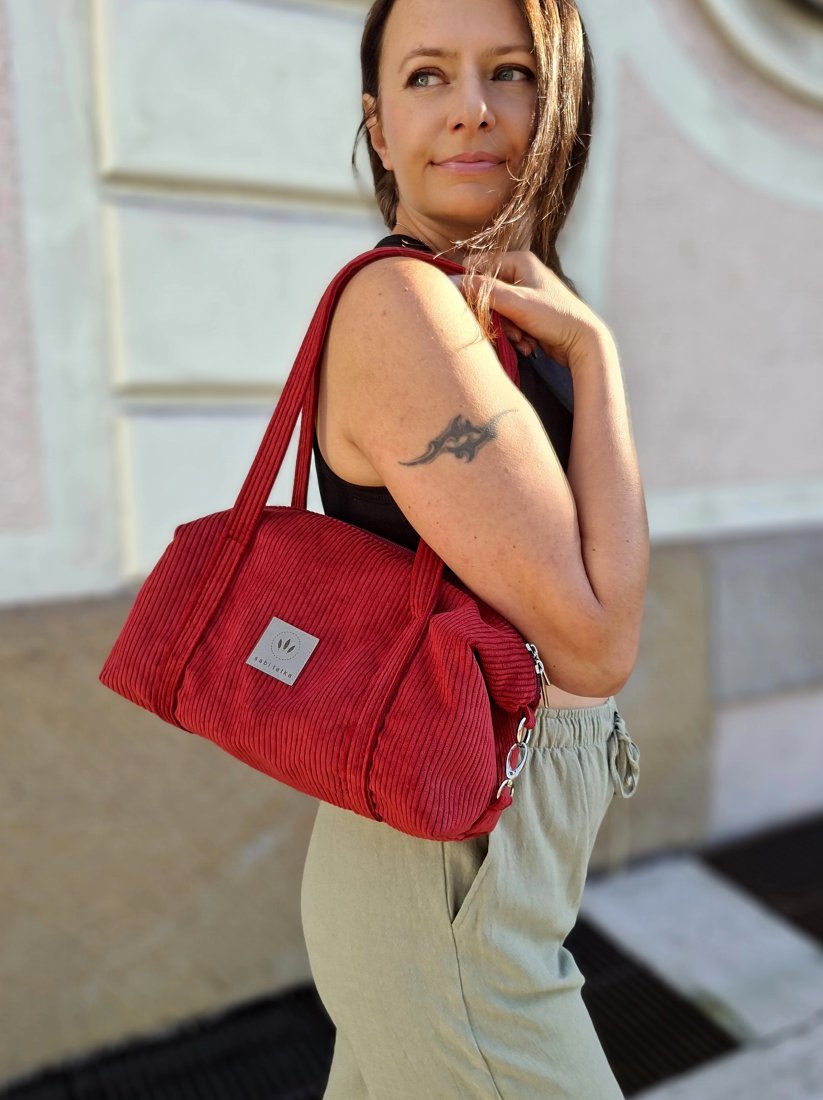 Torebka o podłużnym kształcie w wersji sztruksowej w pięknym odcieniu czerwieni.