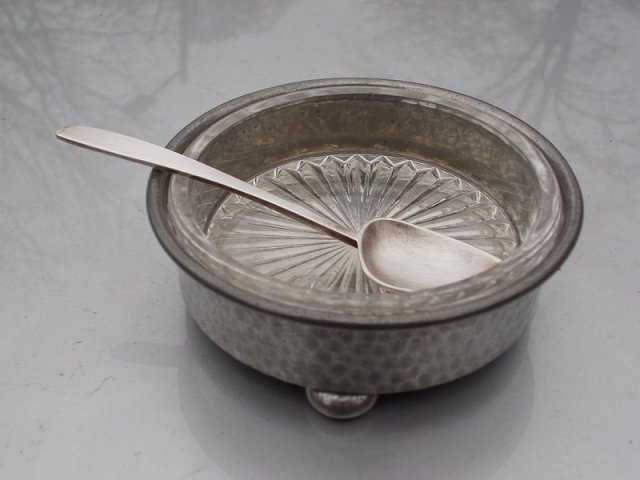 Wyjątkowe naczynie - uszlachetnione dawną datą, sygnowane jakością Howard Pefter, 1135. Rarytas i wielka rzadkość - kompletne, dwuczęściowe - metal i grube, ładnie rżnięte szkło. Celebracja sztuki stołu - na dipy, chrzan, orzeszki i inne stołowe niewielkie cuda i smaki :) Bez łyżeczki... Góra 10; dół 9; wysokość 3 cm. Stara rzecz z duszą, bez uszczerbień, wgnieceń czy pęknięć - stan zachowania bardzo dobry.