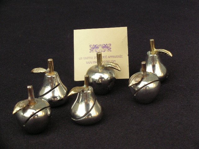 Świetne, ciężko-szlachetnie-niklowe stojaczki na imienne wizytówki stołowe dla gości. Precyzyjne wykonanie, listki i ogonki mosiądzowane. Nowoczesne, eleganckie i z dowcipem :) 2,5 x 3 i 3 x 3,5 cm. Stan zachowania bardzo dobry, z oczywistymi śladami polerowania.