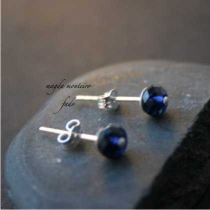 Kolczyki wykonane zostały całkowicie z ręcznie oksydowanego i polerowanego srebra. Kamienie: przepiękne, precyzyjnie szlifowane ekskluzywne kryształy Swarovski 0,6 cm w kolorze granatowym. Bigle sztyfty. Kolczyki mogą stanowić komplet z pierścionkiem.