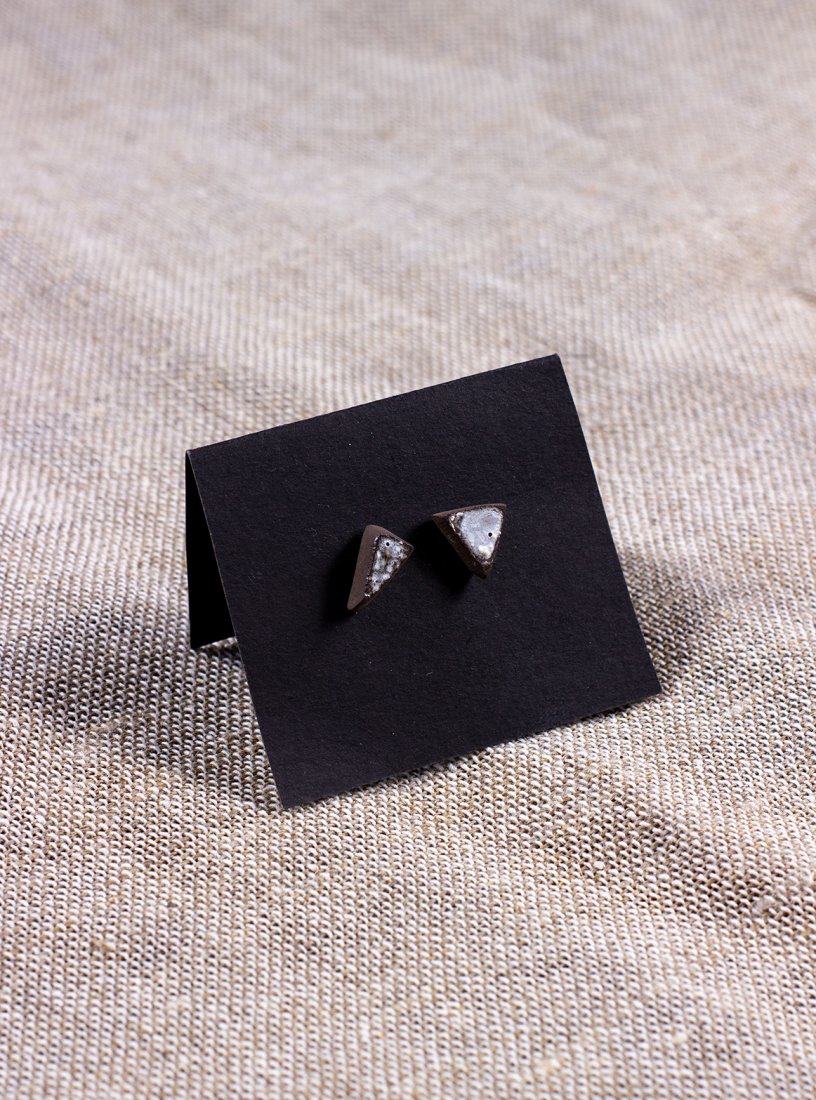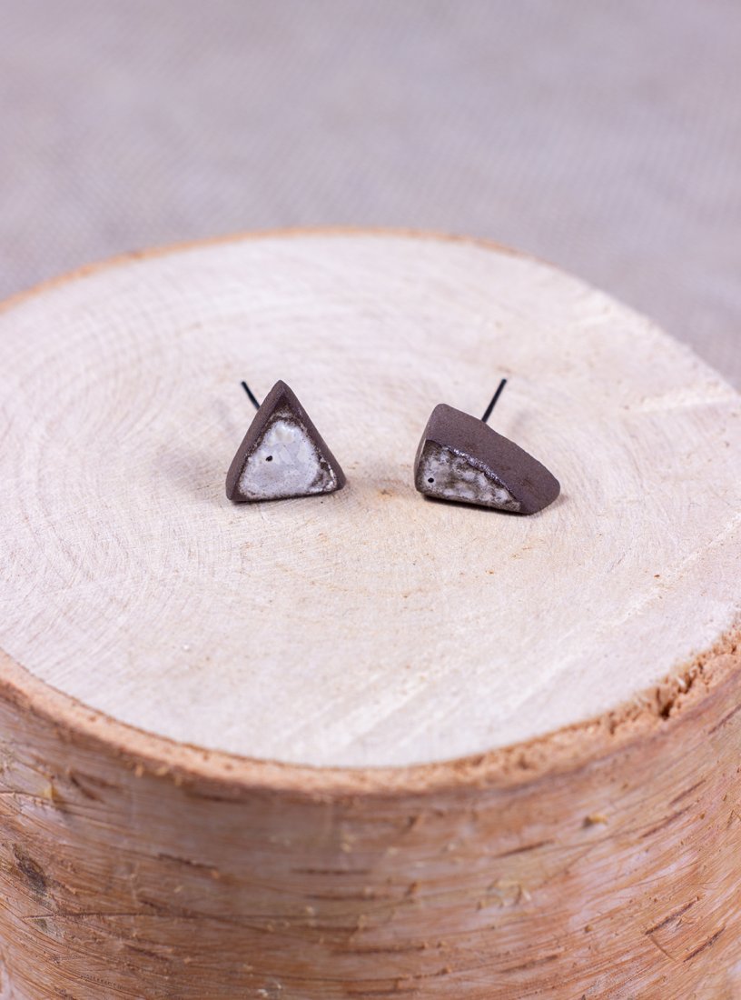 Asymetryczne, ręcznie wykonane ceramiczne kolczyki. Ulepione z ciemnej gliny, szkliwione białym szkliwem. Zamontowane na stalowych sztyftach.
