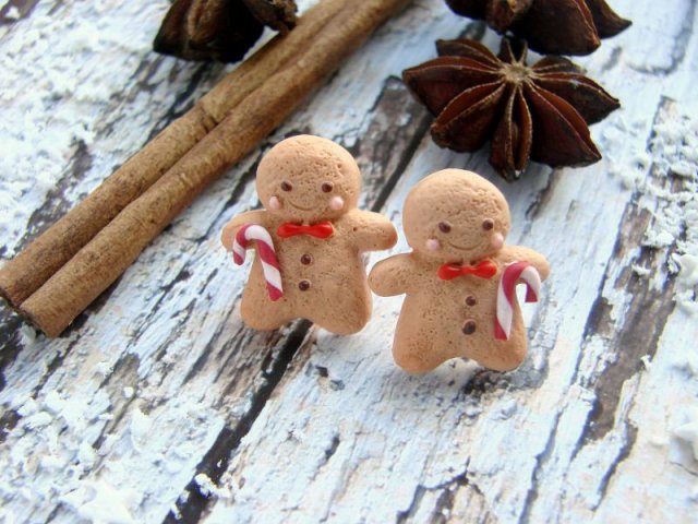 Urocze kolczyki sztyfty z małymi ciasteczkowymi ludkami wykonanymi z fimo. Wielkość ludka: 2 cm. Zatyczki w zestawie