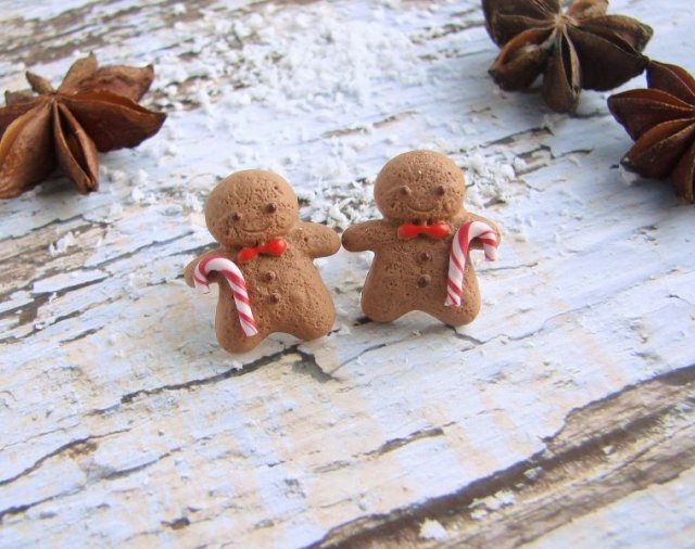 Urocze kolczyki sztyfty z małymi ciasteczkowymi ludkami wykonanymi z fimo. Wielkość ludka: 2 cm. Zatyczki w zestawie