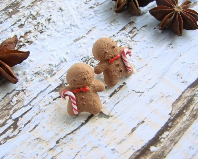 Urocze kolczyki sztyfty z małymi ciasteczkowymi ludkami wykonanymi z fimo. Wielkość ludka: 2 cm. Zatyczki w zestawie