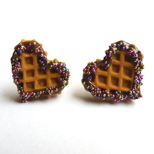 Urocze kolczyki sztyfty-miniaturowe gofry z polewą czekoladową i psypką. Wykonane z masy termoutwardzalnej FIMO i półfabrykatów w kolorze srebrnym. Szerokość gofra: 1,8cm