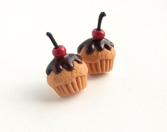 Słodkie kolczyki sztyfty maleńkie muffinki z czekoladową polewą i wisienką wykonane ręcznie z masy termoutwardzalnej fimo. Wielkość muffinek: 1,5 cm. Sztyfty w kolorze srebrnym, zatyczki z zestawie
