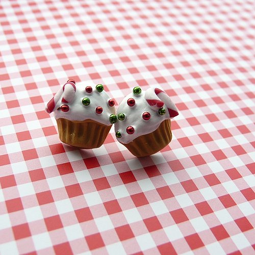 Urocze kolczyki sztyfty-miniaturowe muffinki z białą polewą, lizakami i posypką:) wysokość muffinki: 1cm, silikonowe zatyczki w zestawie. Wysyłam ozdobnie zapakowane;)