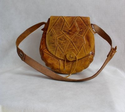 Sztywna torebka uszyta z kawałków skóry naturalnej.Spodnia warstwa ze skóry ekologicznej.W środku jedna komora.Klapka z przyszytym dużym guzikiem,niżej paseczek do okręcania w koło guzika.Pasek łączony z trzech części do noszenia na ramieniu.Stan ogólny bardzo dobry-.Wysokość 23 cm.szerokość 21 cm,w najszerszym miejscu,pasek długości 86 cm.
