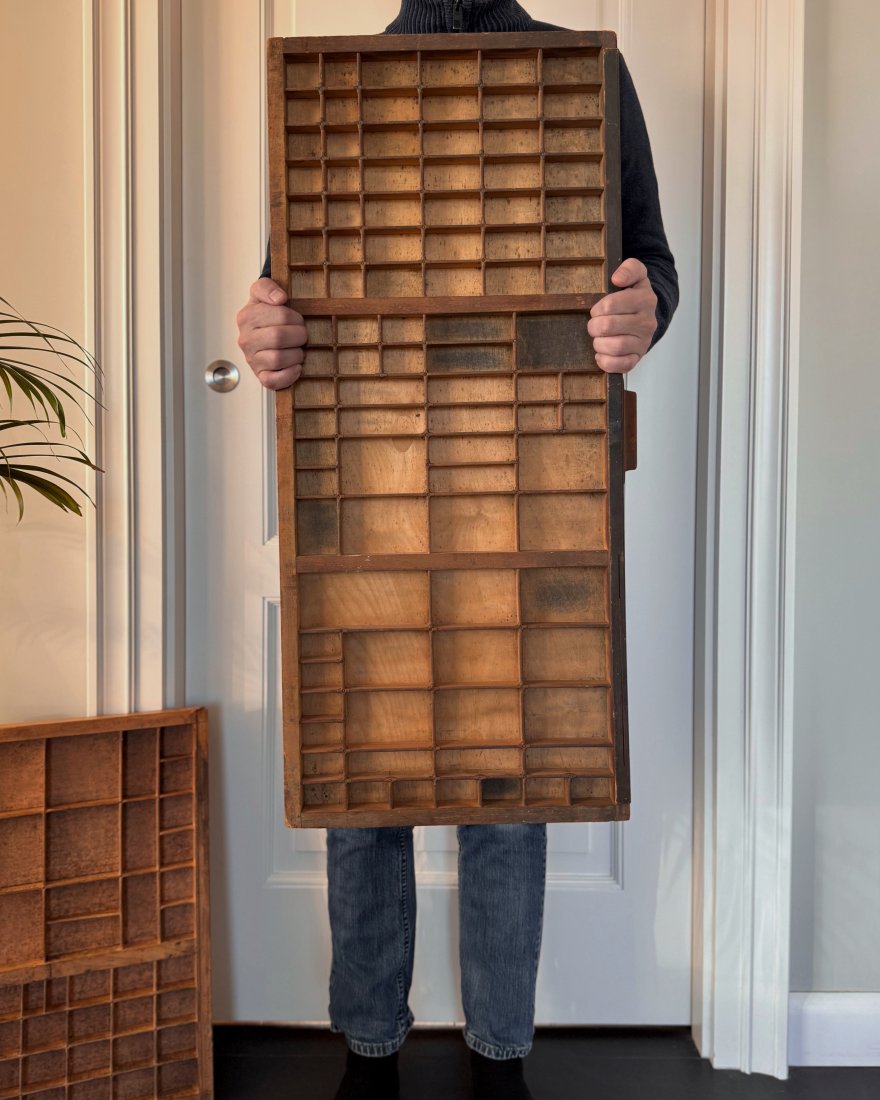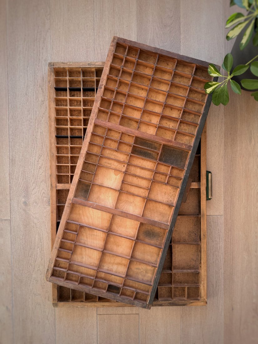 Stara drewniana szuflada drukarska, tzw. kaszta, która oryginalnie służyła do przechowywania czcionek drukarskich.