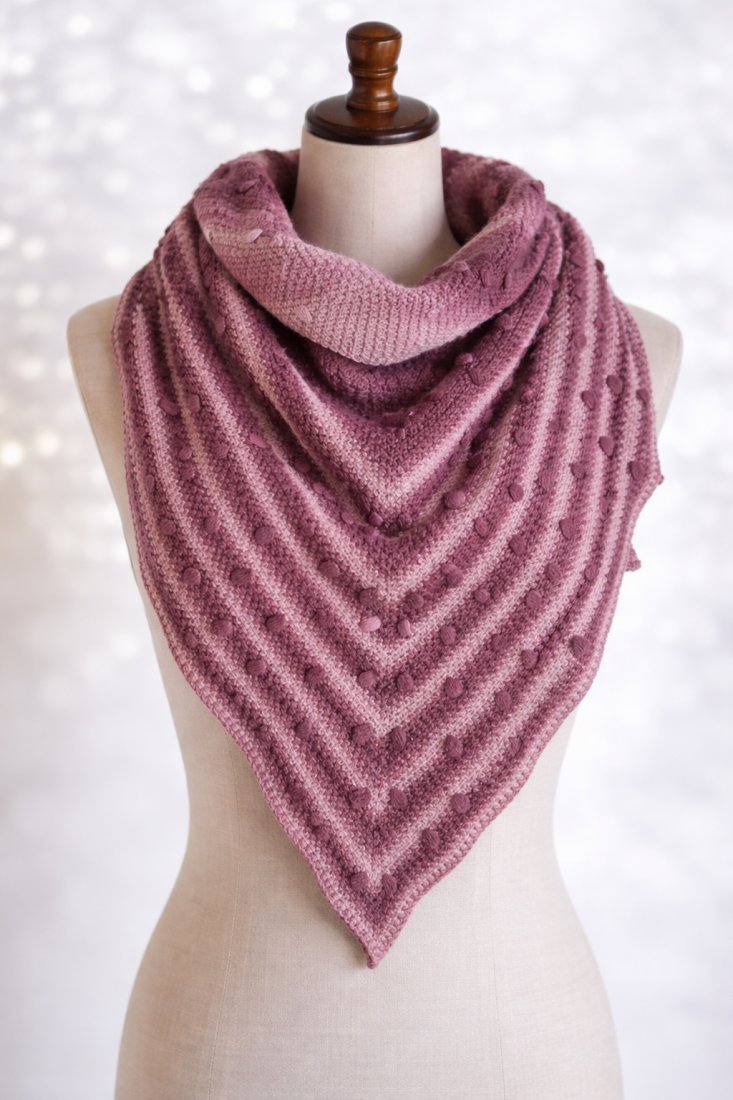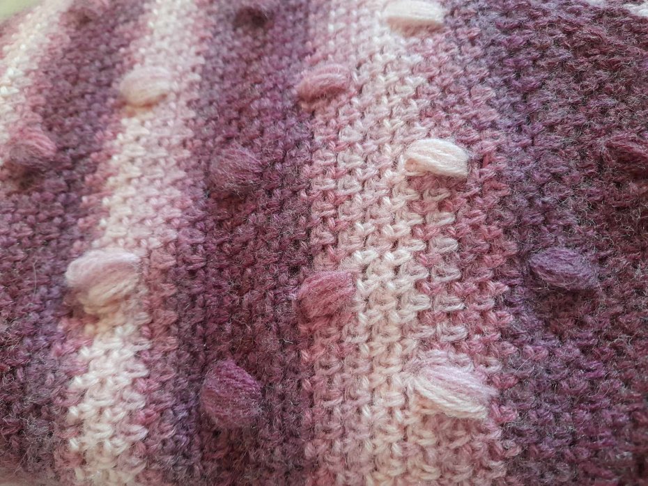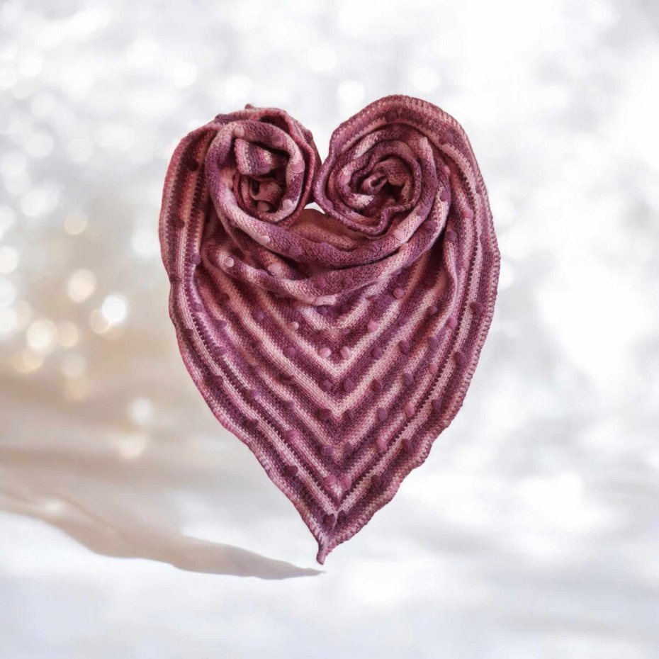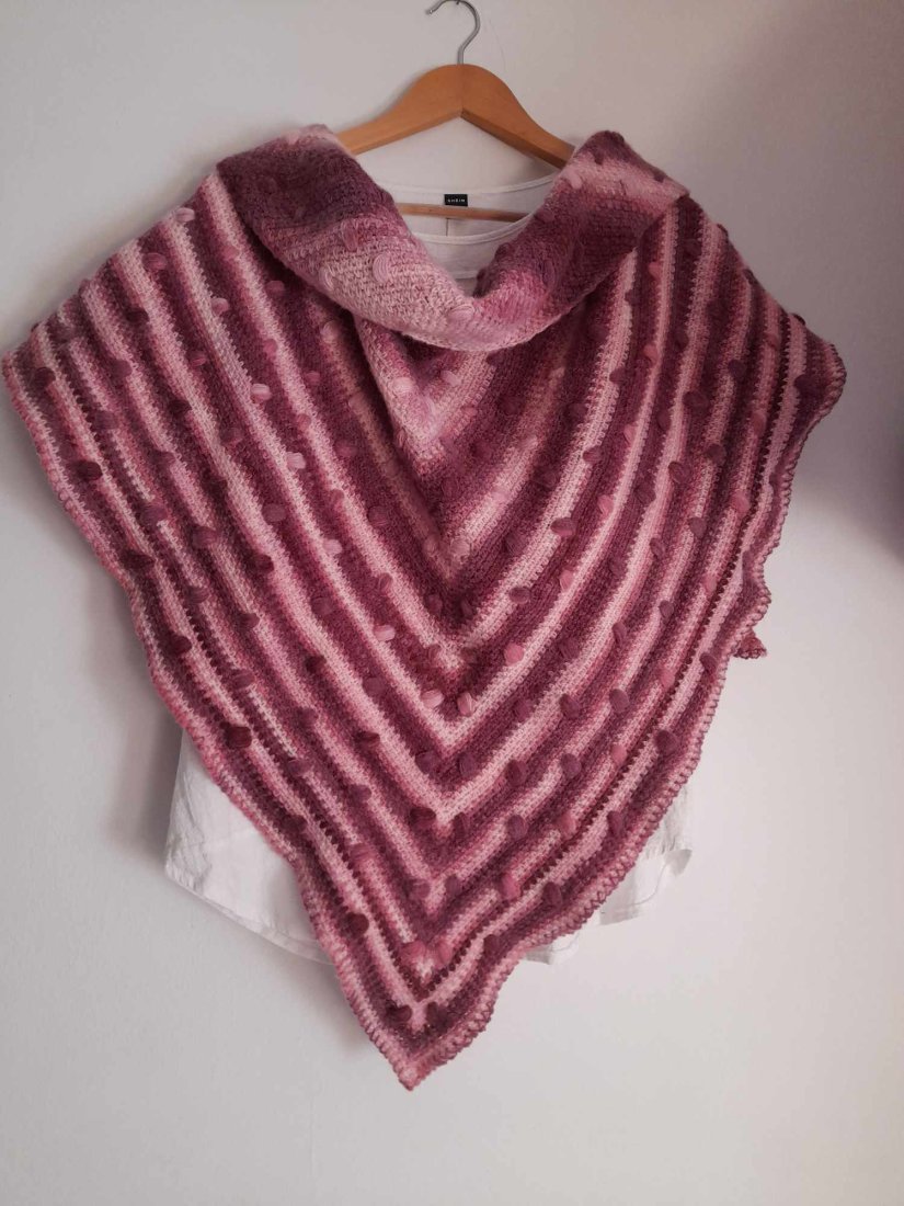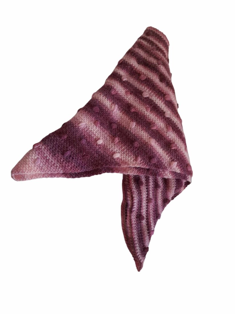 Szydełkowa chusta wykonana z włóczki angora gold batic. Długość najdłuższego boku 200 cm; pozostałe boki 170 cm /bez naciągania/. Miękka i delikatna. Wzór mech z bąbelkami. Kolory pięknie przechodzą między różem do bordo. Na wiosenne, jesienne i zimowe wieczory. Będzie ślicznym dodatkiem do każdego ubioru. Chusta nie jest blokowana.