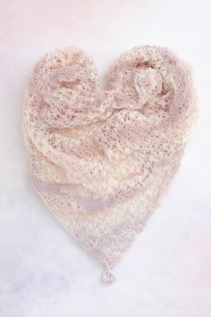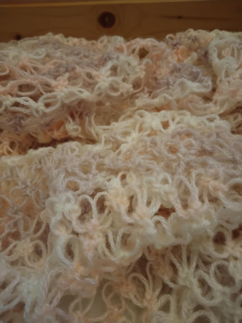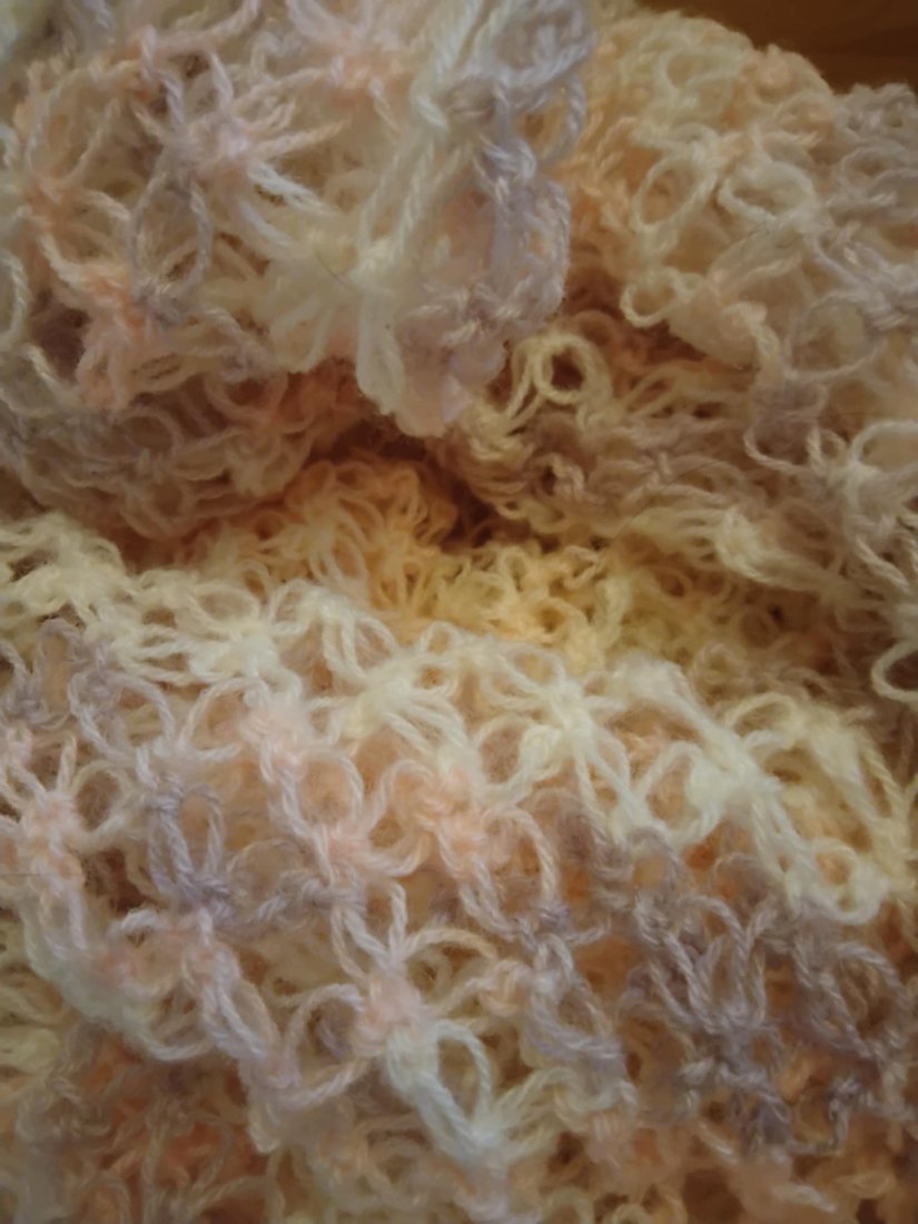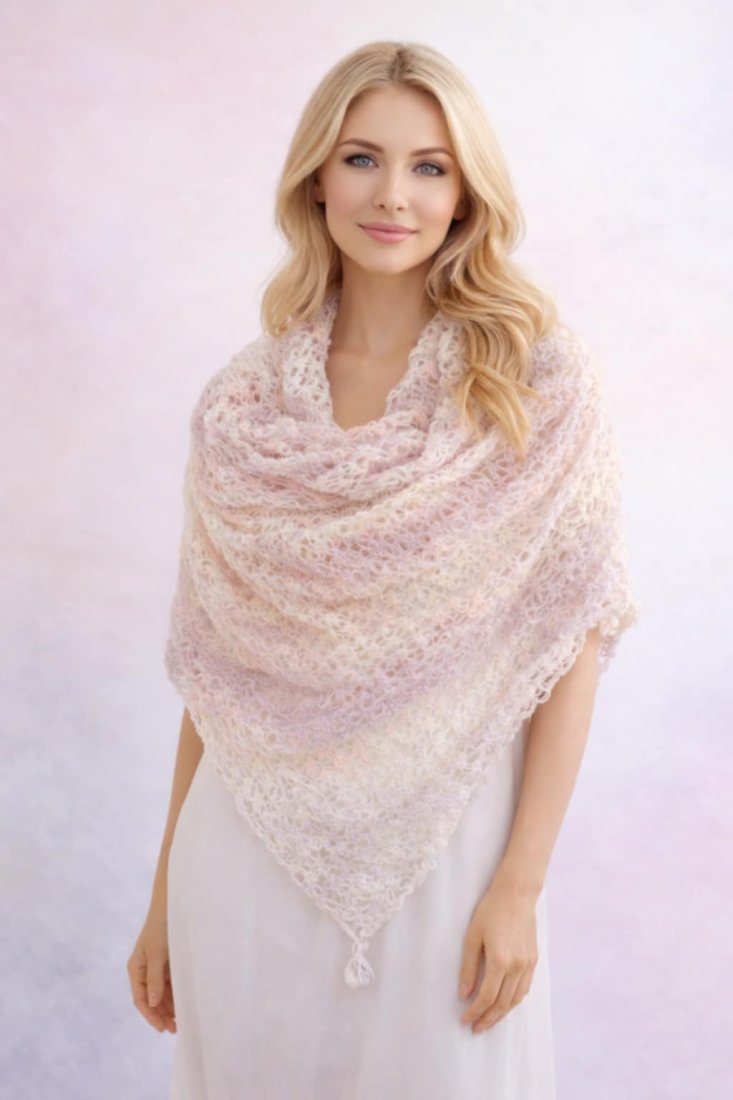 Szydełkowa chusta wykonana z włóczki alize angora gold. Długość najdłuższego boku ok. 250 cm; pozostałe boki ok 151 cm. Miękka i delikatna. Przepiękna kolor biel kremowa przechodząca w delikatny róż i delikatny fiolet, Gorąco polecam. Na wiosenne, jesienne i zimowe wieczory. Będzie ślicznym dodatkiem do każdego ubioru. Chusta nie jest blokowana.