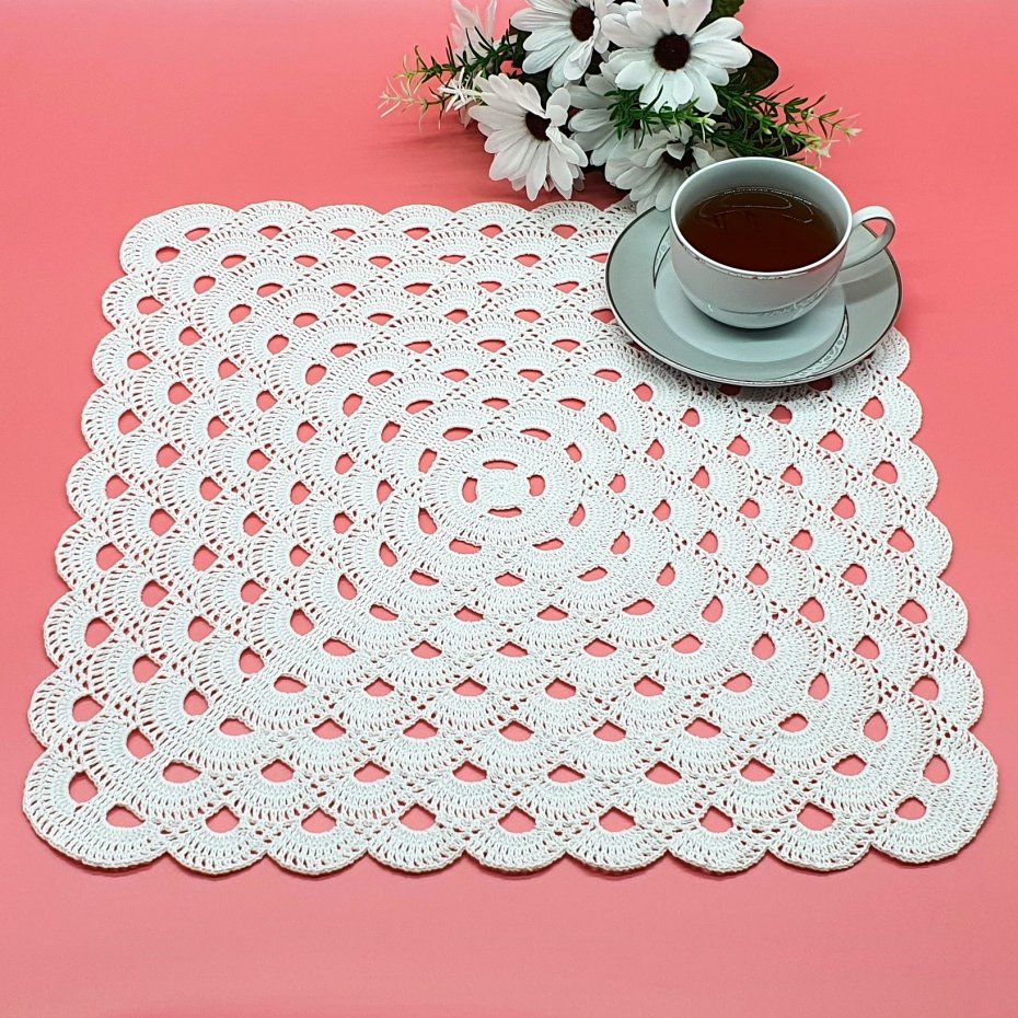 Kwadratowa serweta w kolorze białym wykonana została na szydełku, z kordonka wyprodukowanego w Polsce. Wymiar serwety to 42 cm x 42 cm