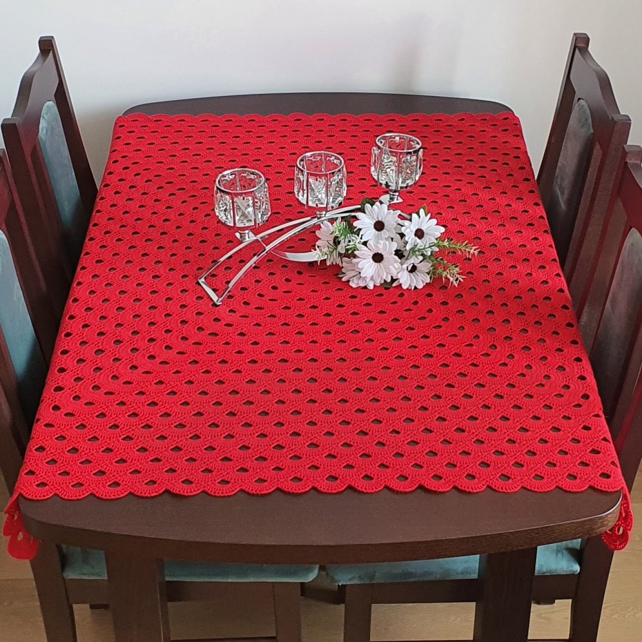 Kwadratowa serweta w kolorze czerwonym wykonana została na szydełku, z bawełnianego kordonka wyprodukowanego w Polsce. Wymiary serwety to ok. 112 cm x 112 cm. Na zamówienie mogę wykonać serwetę w innym kolorze lub rozmiarze.