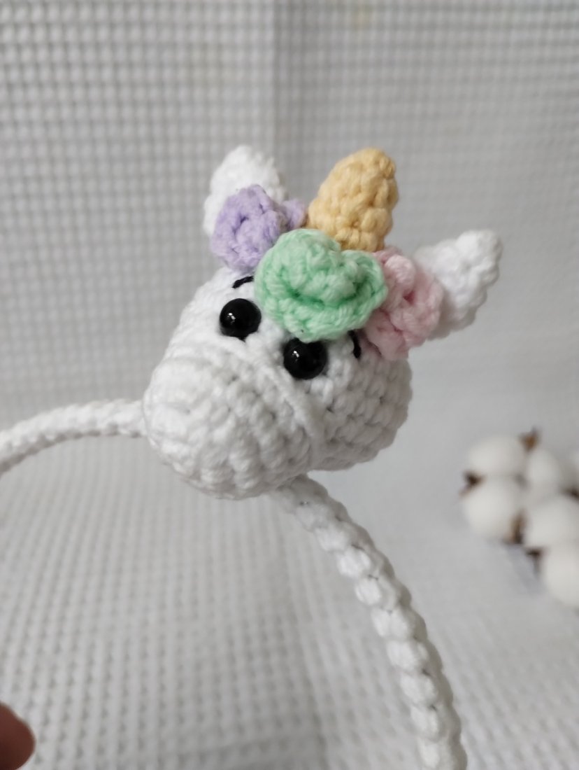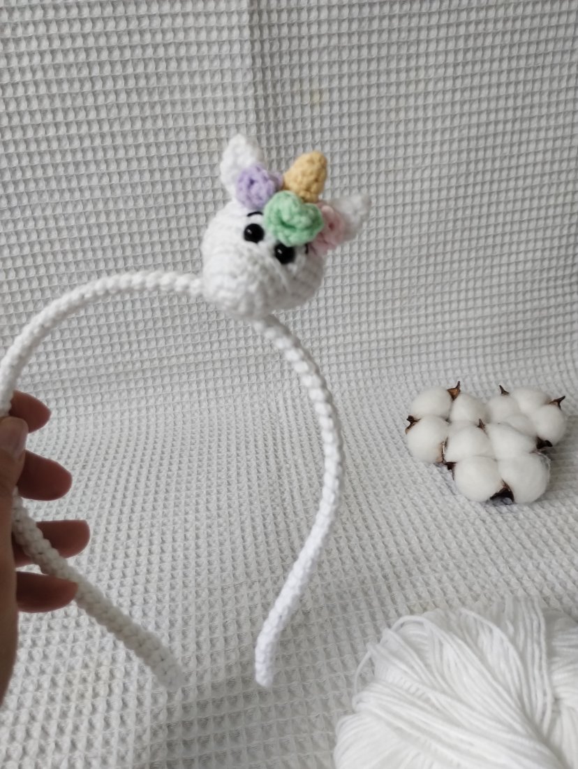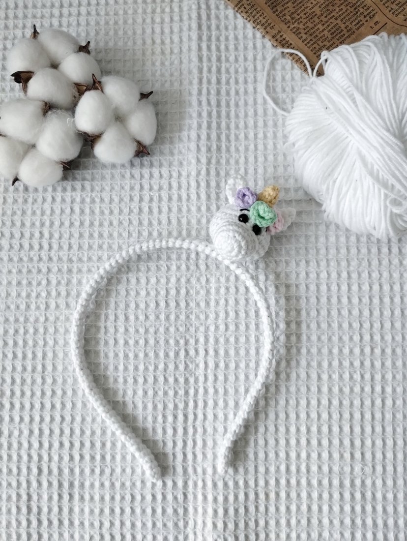 Wnętrze opaski stanowi metalowa baza, która została przeze mnie pokryta włóczkowym tunelem. Dzięki temu nie będzie drapać, będzie delikatnie przylegać do włosów. Ozdobę opaski stanowi przyszyta głowa jednorożca