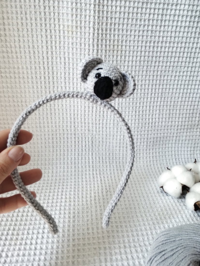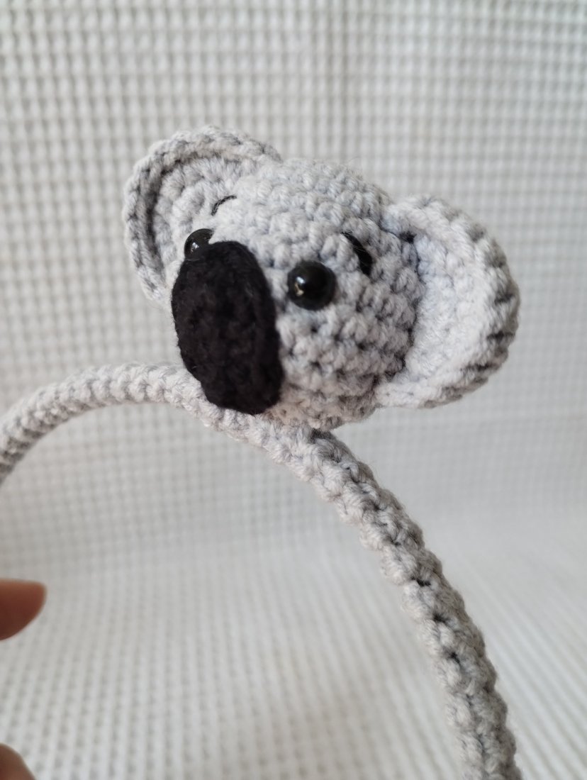 Wnętrze opaski stanowi metalowa baza, która została przeze mnie pokryta włóczkowym tunelem. Dzięki temu nie będzie drapać, będzie delikatnie przylegać do włosów. Ozdobę opaski stanowi przyszyta głowa koali