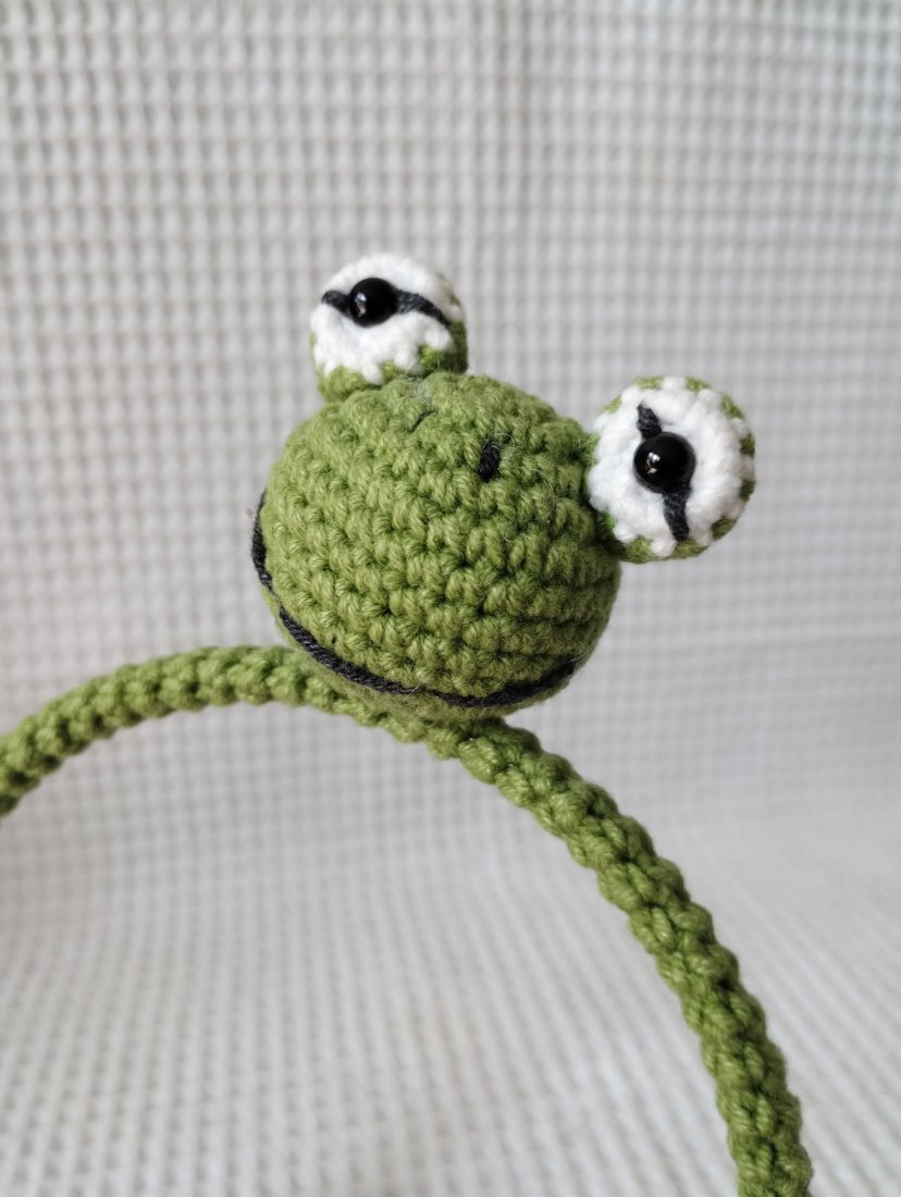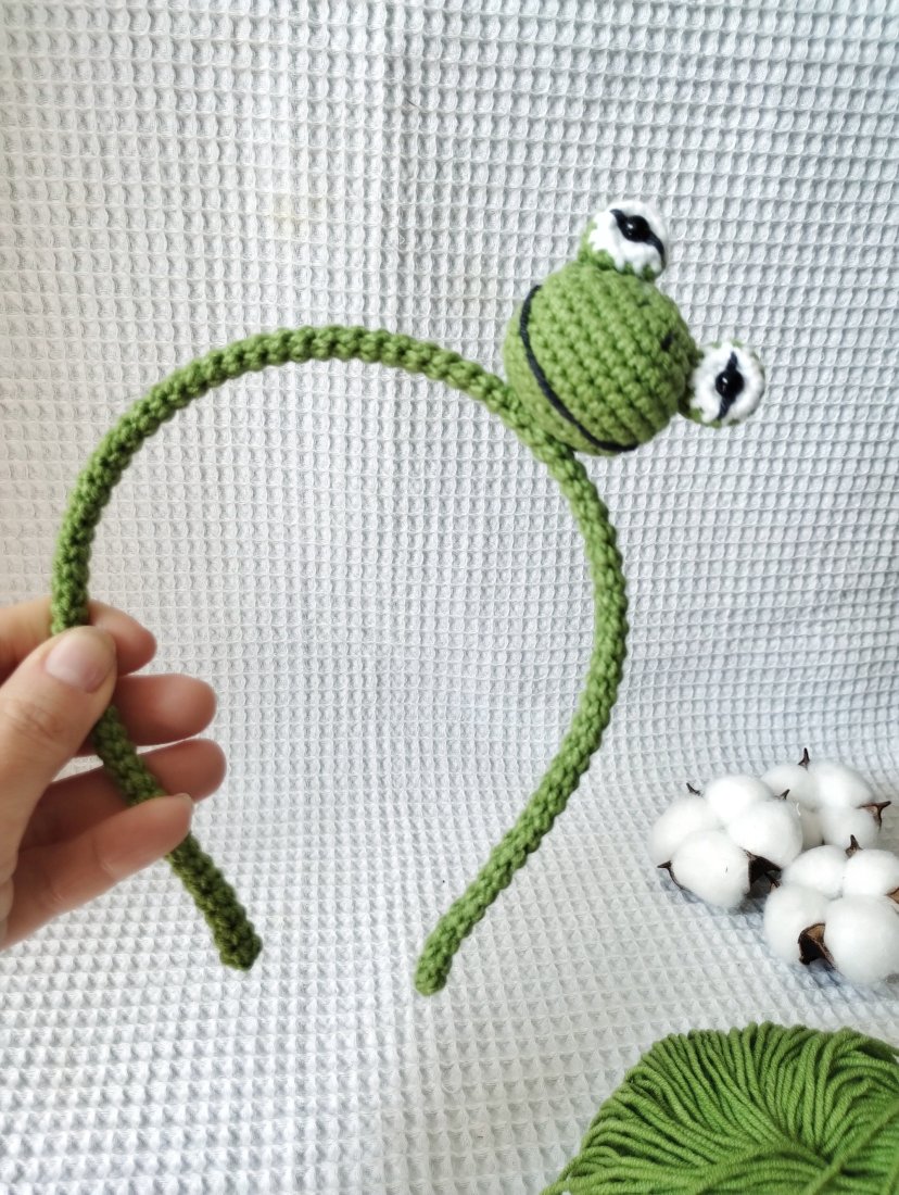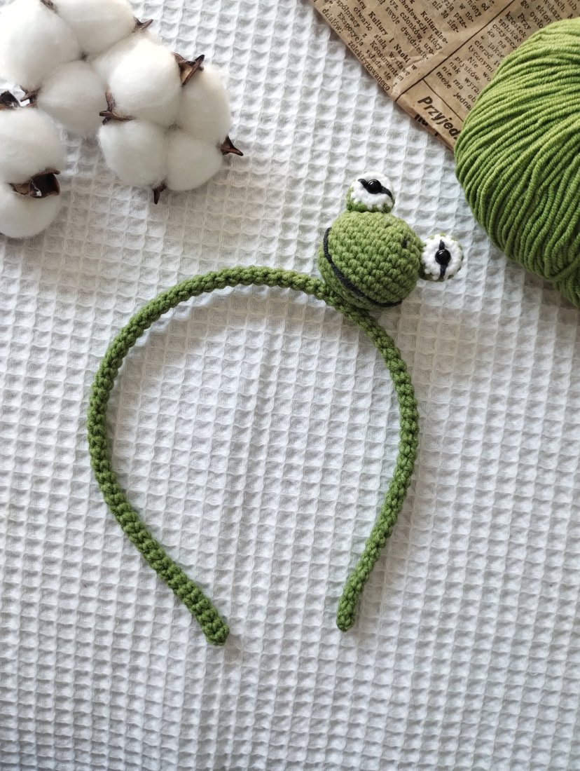 Wnętrze opaski stanowi metalowa baza, która została przeze mnie pokryta włóczkowym tunelem. Dzięki temu nie będzie drapać, będzie delikatnie przylegać do włosów. Ozdobę opaski stanowi przyszyta głowa żabki