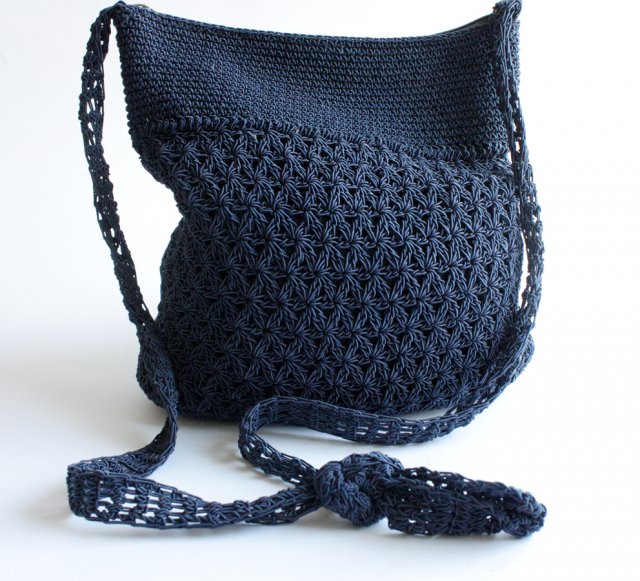 Szydełkowa torba wykonana z jedwabnego kordonku. Posiada podszewkę. Zapinana na suwak. Na zewnątrz kieszeń zapinana na suwak.