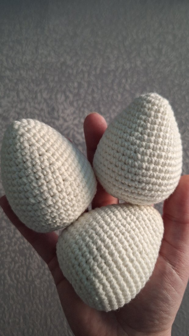 3 szydełkowe jajka dekoracyjne w kolorze białym.