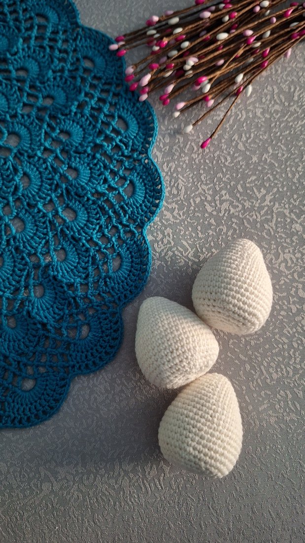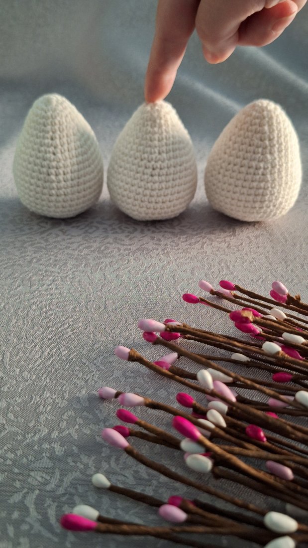 Każde jajko zostało ręcznie wykonane na szydełku, z przyjemnej w dotyku włóczki i wypełnione miękkim wkładem, dzięki czemu jest lekkie, sprężyste i bardzo dekoracyjne.