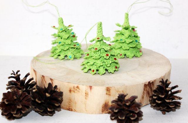 Zestaw trzech zawieszek w kształcie choinek. Wykonane z zielonych nici bawełnianych na szydełku, usztywnione krochmalem i ozdobione kryształkami.