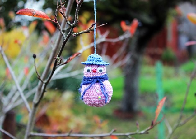 Różowy bałwanek w niebieskim kapelusiku i z granatowym szaliczkiem. Wykonany z nici bawełnianych na szydełku, wypełniony gąbką.