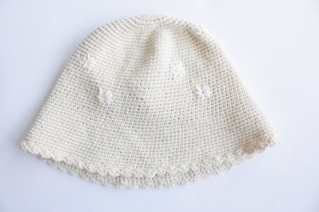 Subtelny, miękki kapelusz wykonany ręcznia na szydełku z bawełny.