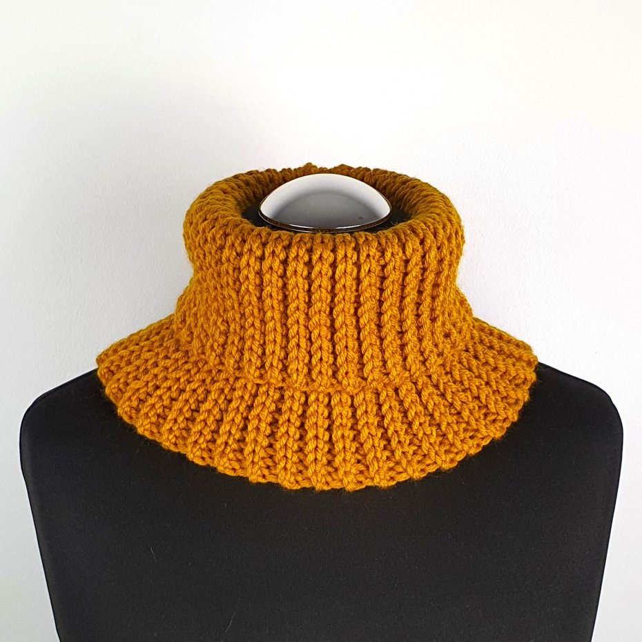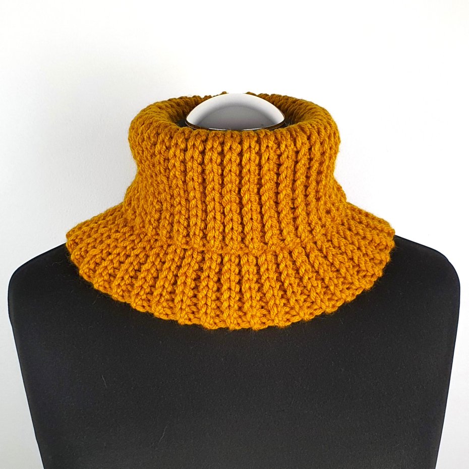 Komin na szyję w kolorze musztardowym, wykonany został na szydełku, z włóczki 25% wełny, 75% akrylu.