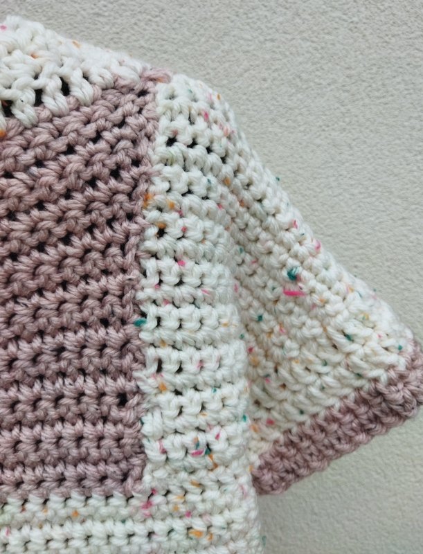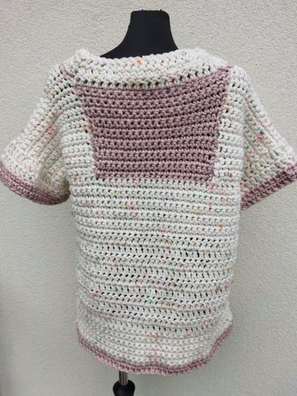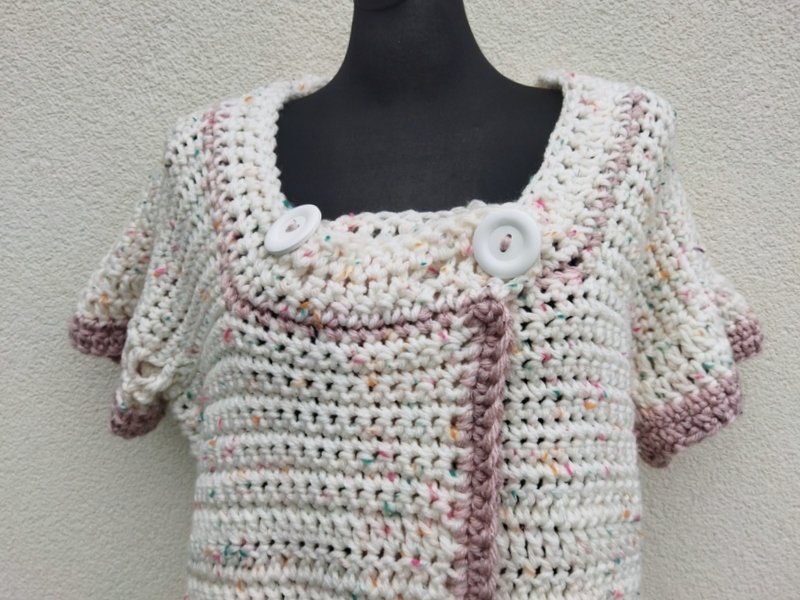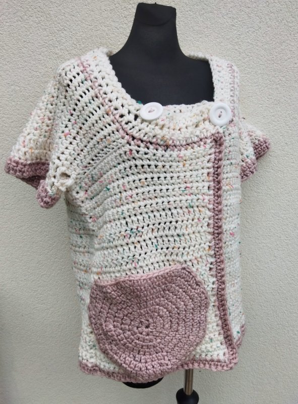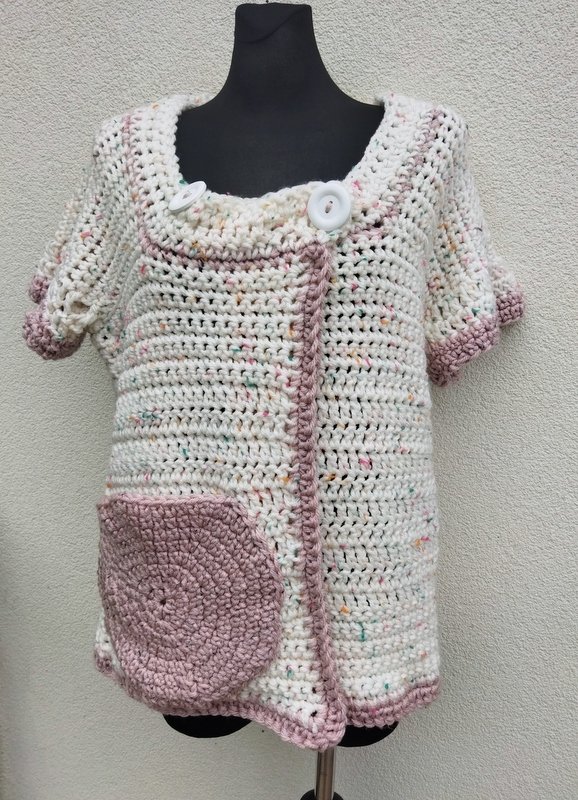 Sweter z grubej ale miękkiej najprawdopodobniej akrylowej włóczki w nakrapianym białym kolorze z elementami wykończeniowymi w rozwodnionym wrzosowym kolorze Dziergany na szydełku, z okrągła duża kieszenią , zapinany u góry na dwa duże guziki