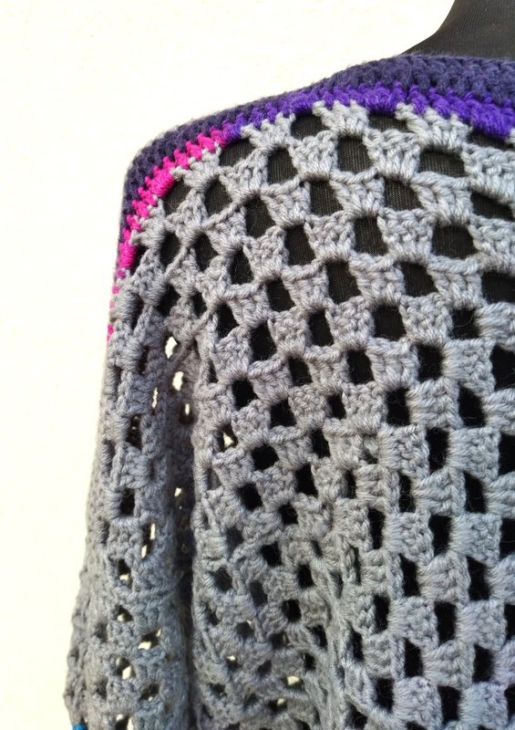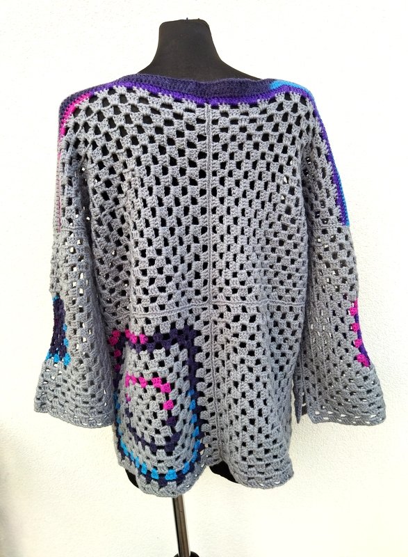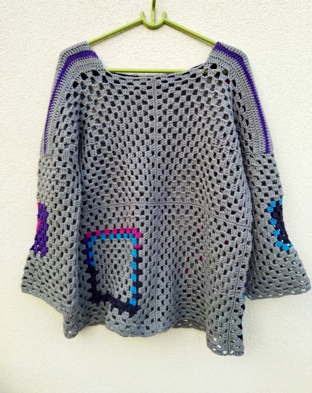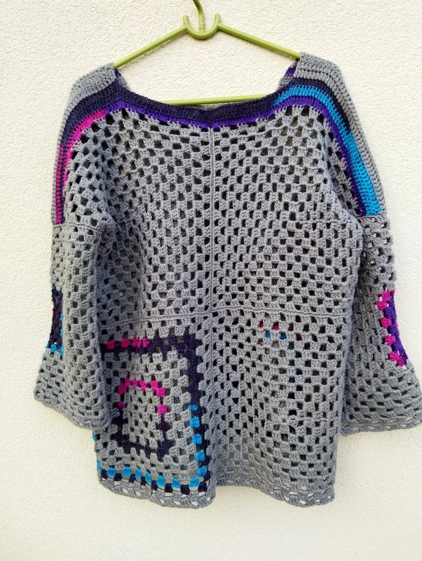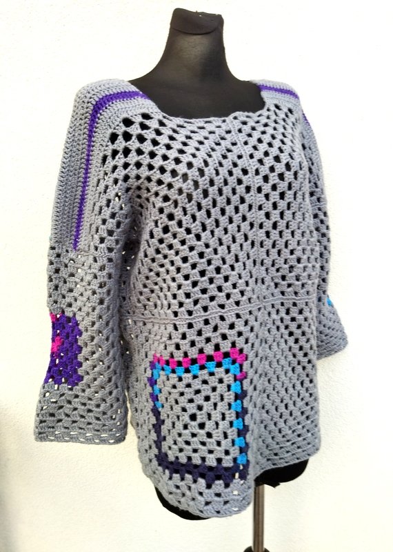Ażurowy sweter dziergany szydełkiem w niebiesko-stalowym kolorze, ożywiony fuksjowymi, granatowymi, fioletowymi i niebieskimi wzorami. Prosty krój z dekoltem karo .