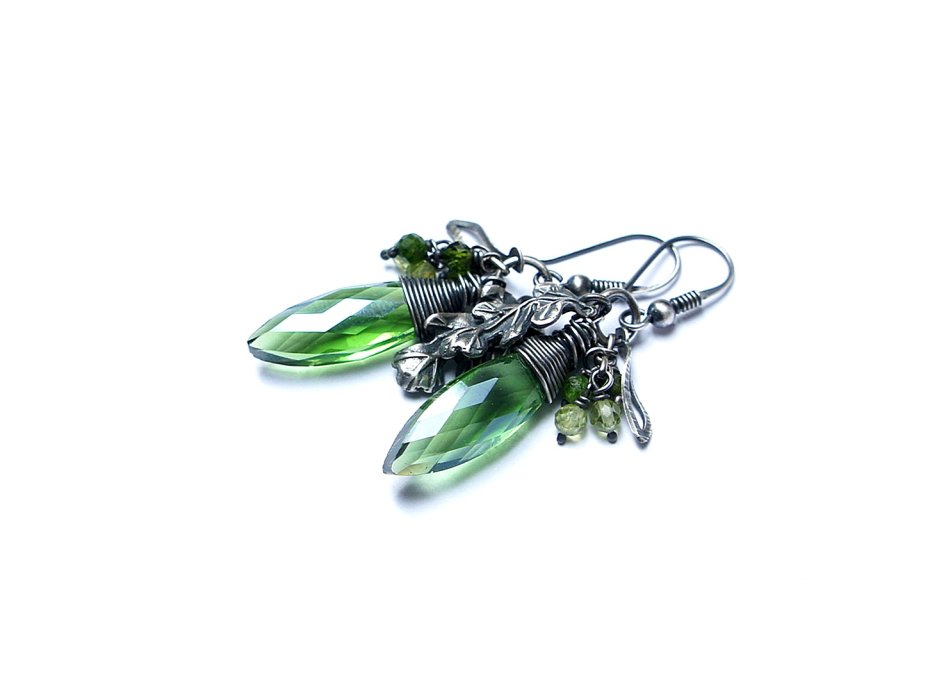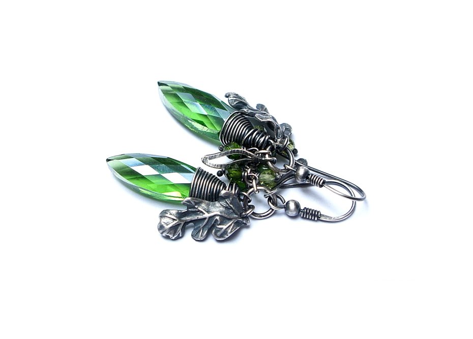 Kolczyki wykonane ze srebra [pr. 925] w połączeniu z kryształowymi markizami [22mm] oplecionymi drutem z czystego srebra [pr.999] ,fasetowanymi kuleczkami diopsydów [3mm ] , cyrkoniami [4mm] oraz srebrnymi listkami. Srebro oksydowane i przetarte. Całkowita długość kolczyków 5cm. Biżuteria ozdobnie zapakowana