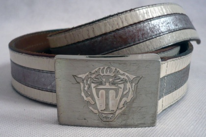 Solidny pasek uszyty z grubej skóry - malowanej na biało i srebrno -celowo przetarty .Duża-metalowa klamra z logo .Zapinany w klamrze-na ścisk.