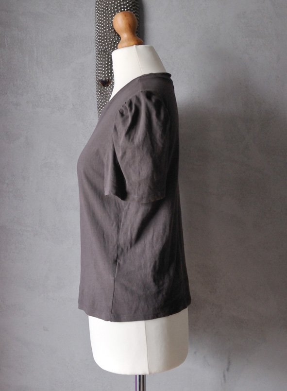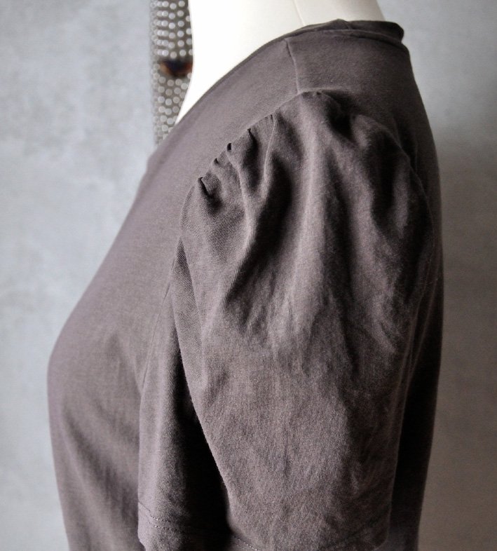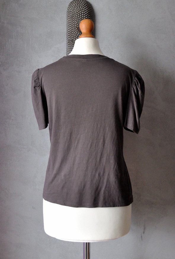 Uszyty z cienkiej, elastycznej bawełny w odcieniu gorzkiej czekolady (ciemny brąz). Materiał przyjemny w dotyku, miękki, dobrej jakości. Mały, obszyty ściągaczem dekolt; Rękawy bufiaste. Fason krótszy. Uroczy i dziewczęcy.