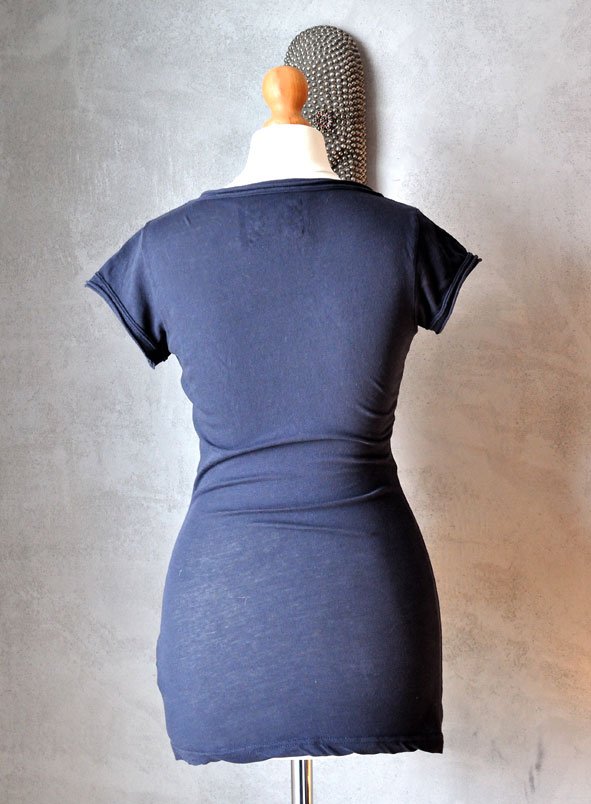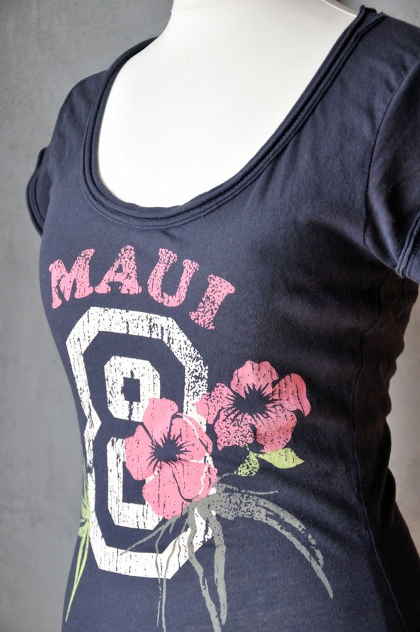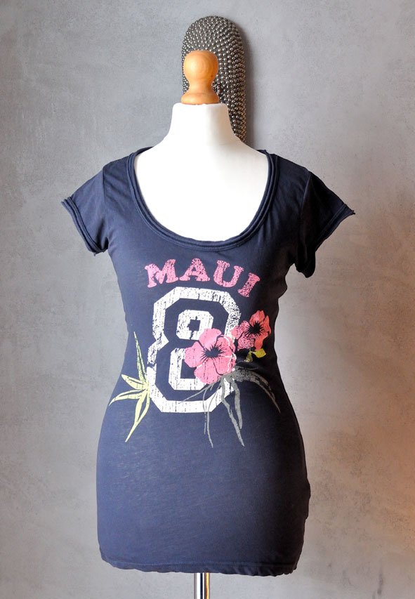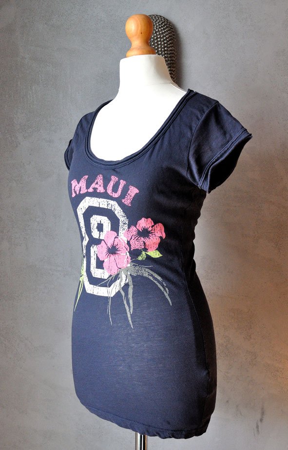 Uszyty z cienkiej, elastycznej bawełny w odcieniu granatu. Materiał przyjemny w dotyku, miękki, dobrej jakości. Z przodu duży nadruk: cyfra 8ozdobiona hawajskimi kwiatami i napisem Maui.