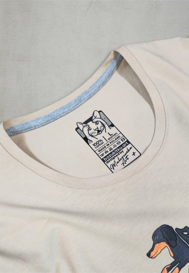 Pielęgnacja: Prać w max. 40°C – jamnik nie lubi gorących kąpieli. Nie wybielać – to nie dalmatyńczyk. Prasować na lewej stronie, w średniej temperaturze – nie znosi przypaleń. Nie suszyć w suszarce – woli suszenie na świeżym powietrzu.