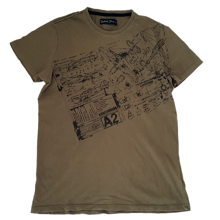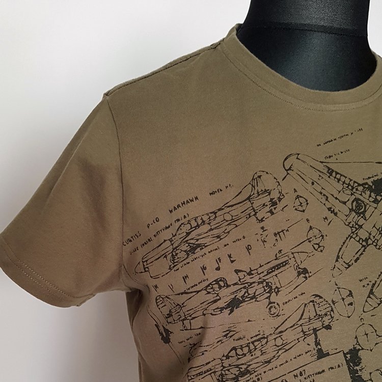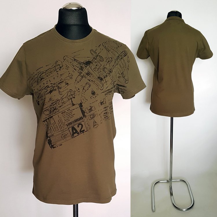 Koszulka z krótkim rękawem, z dzianiny bawełnianej w kolorze zieleni khaki. Z przodu print z motywami lotniczymi. Basic na co dzień. Krój uniwersalny, będzie pasował zarówno na sylwetkę damską jak i męską. Jeśli miałby być dla mężczyzny, sugerujemy ją raczej rozmiarowi M.