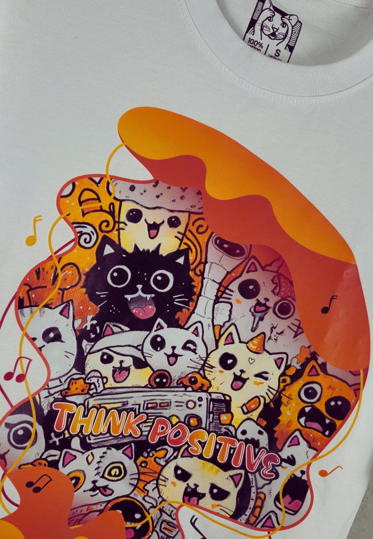 T-SHIRT - KOTY - THINK POSITIVE - UNISEX / OVERSIZE LARGE - BIAŁA