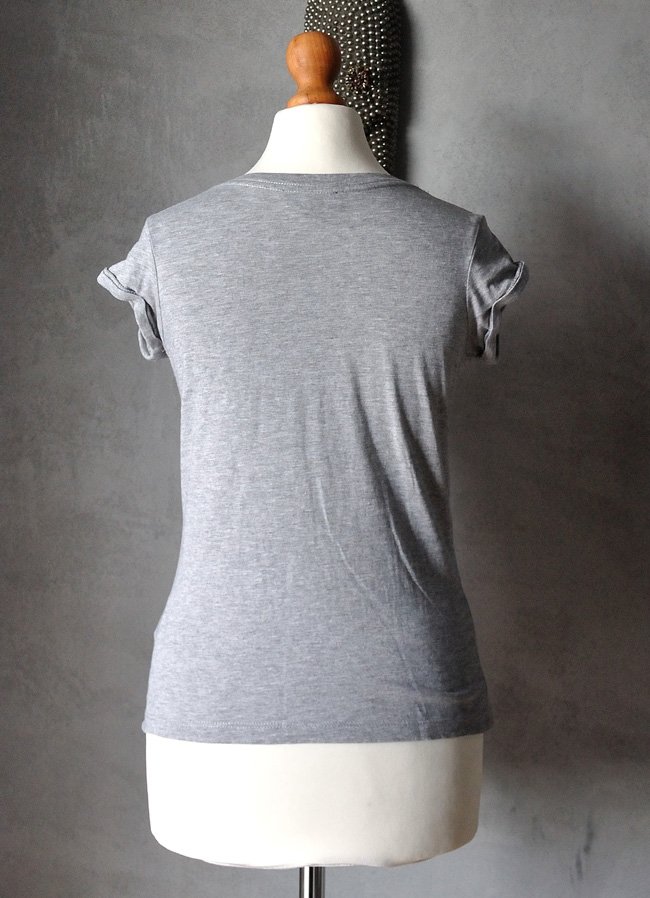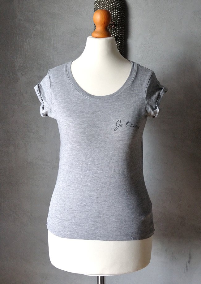 Lekki, bawełniany. Z szarego, melanżowego materiału , okrągłym, nieco większym dekoltem; rękawki zawinięte. Na lewej piersi uroczy napis "Je t'aime".