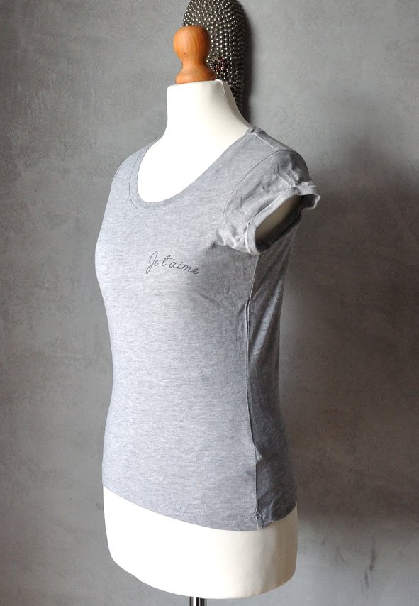 Lekki, bawełniany. Z szarego, melanżowego materiału , okrągłym, nieco większym dekoltem; rękawki zawinięte. Na lewej piersi uroczy napis "Je t'aime".