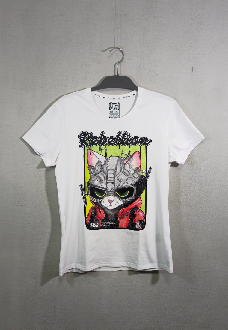 Pielęgnacja: Prać w max. 40°C - jak na gwiezdną energię to i tak sporo, Nie wybielać – istnieje ryzyko wypalenia mocy, Prasować na lewej stronie, w średniej temperaturze - Koci Rebeliant zasługuje na szacunek, Nie suszyć w suszarce – koty zwykle schną naturalnie.