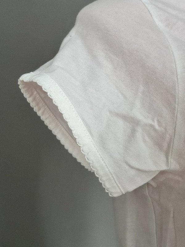 T-shirt ma rozmiar S. Wykonany w 100% z bawełny. Ma napis More Sleep. Ma piękną koronkę przy rękawach.