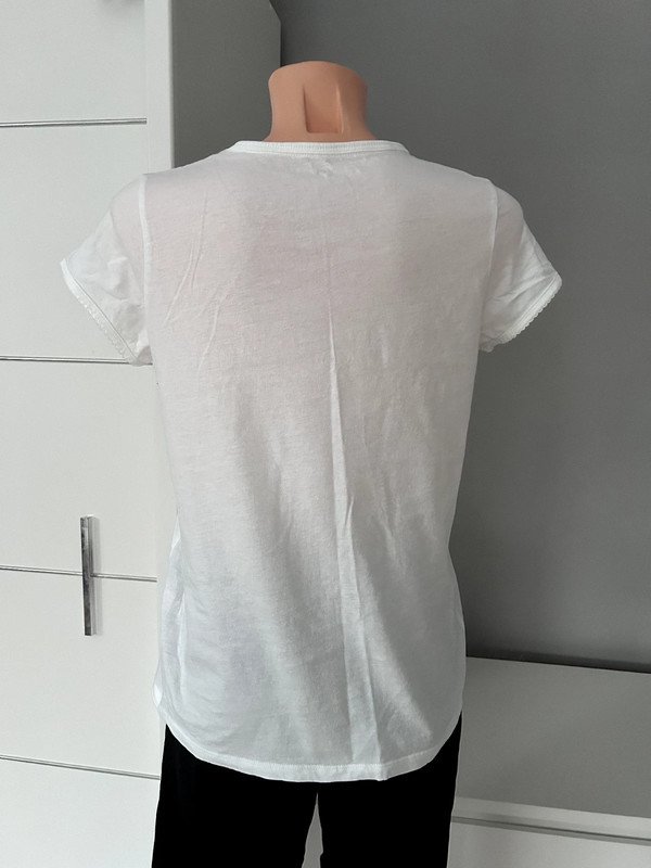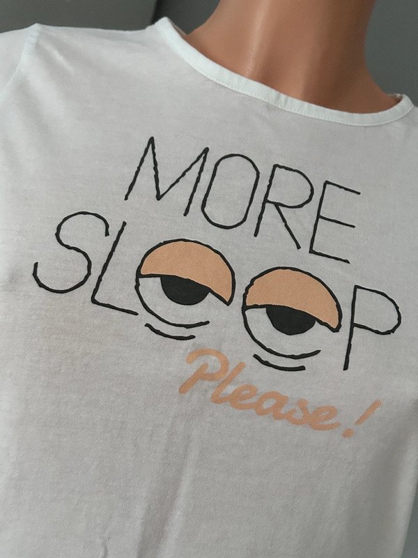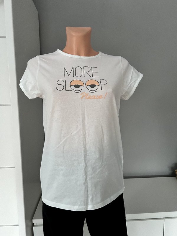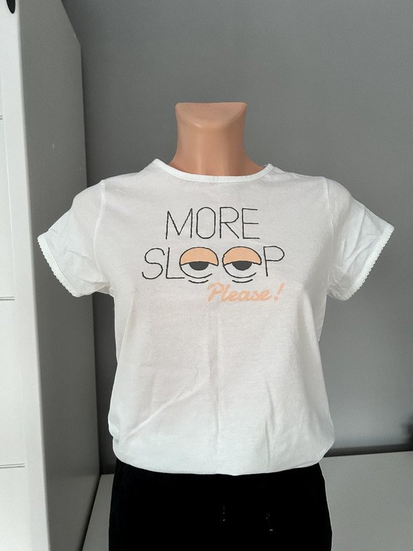 T-shirt ma rozmiar S. Wykonany w 100% z bawełny. Ma napis More Sleep. Ma piękną koronkę przy rękawach.