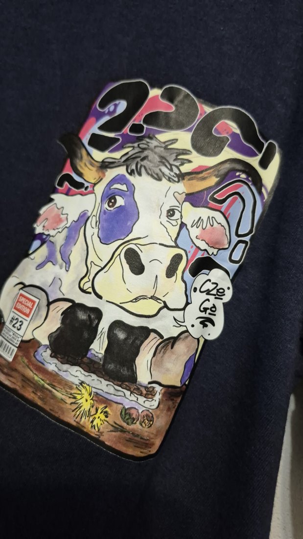 Wygodna, luźna koszulka z unikalnym, kolorowym nadrukiem przedstawiającym artystyczną ilustrację Świskata i Krowy:)