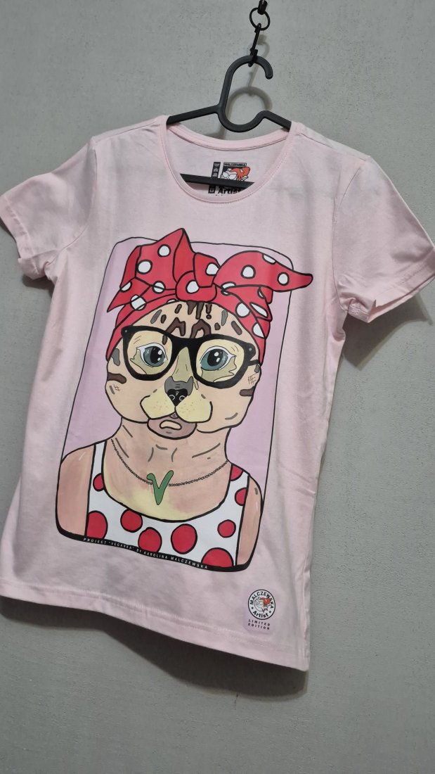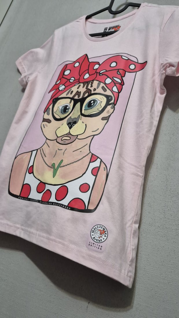 Wygodna, luźna koszulka z unikalnym, kolorowym nadrukiem przedstawiającym artystyczną ilustrację Kotki Veganki :)