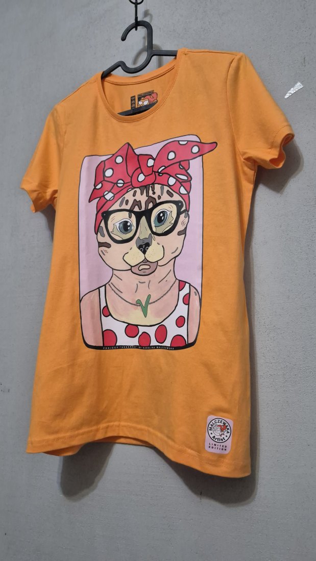 Wygodna, luźna koszulka z unikalnym, kolorowym nadrukiem przedstawiającym artystyczną ilustrację Kotki Veganki :)