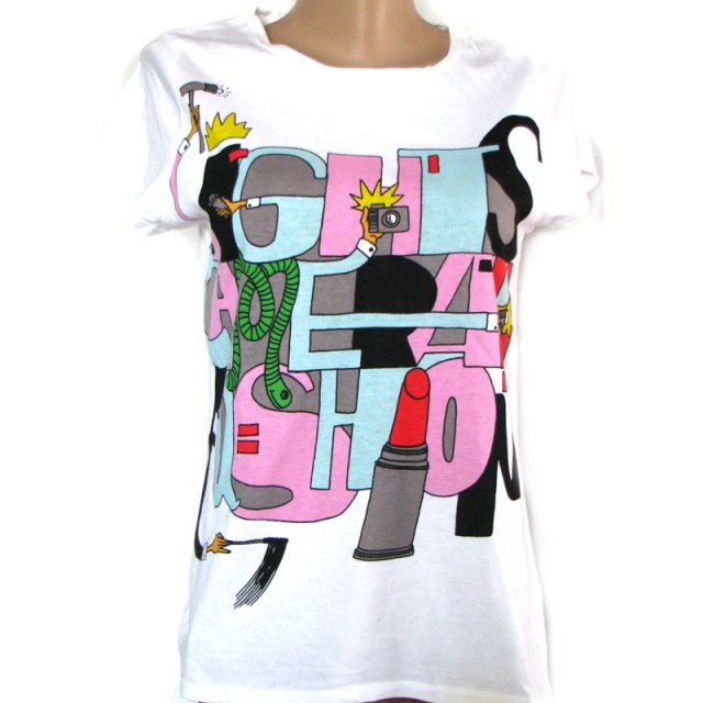 Biały T-shirt firmy ZARA z kolorowym nadrukiem napisów LIGHTS CAMERA FASHION. Wymiary na płasko: biust 43 cm, talia 40 cm, biodra 46 cm. Długość mierzona przodem 59cm.