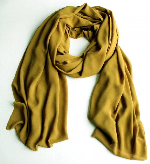 Duży, zwiewny szal w niespotykanym odcieniu tabaczkowym, który można nosić na wiele sposobów.Materiał to prawdopodobnie jedwab naturalny lub syntetyczny.