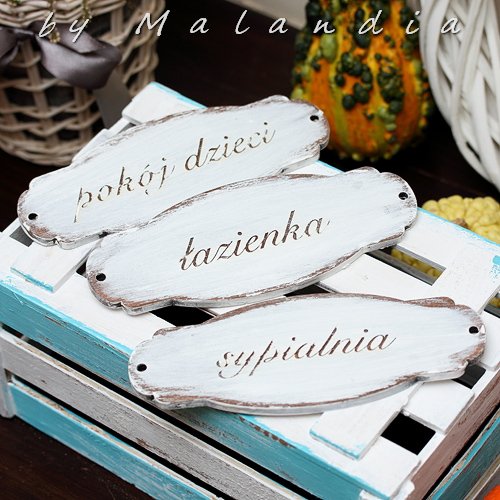 Drewniana tabliczka na drzwi z wygrawerowanym napisem, ręcznie pomalowana metodą shabby chic.